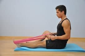 Sentado com a perna esticada e o elástico na ponta do pé. Empurre o elástico para a frente, depois deixe o pé regressar lentamente à posição inicial.